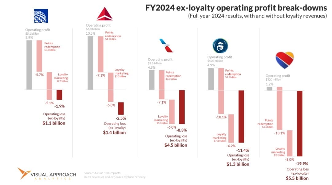 When we back out loyalty revenues (not cash, but we’ll get to that), all large airlines result in a negative operating profit margin.