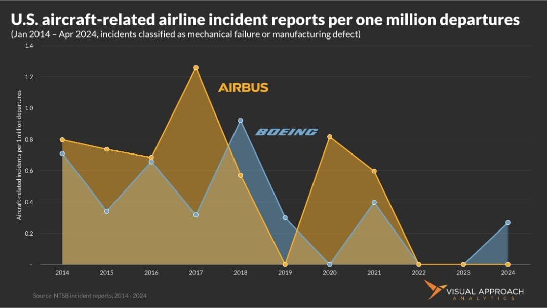 We would label this chart as “boring.” There is no correlation. Boeing and Airbus have very similar rates of aircraft-related incidents, and they are both very low.
