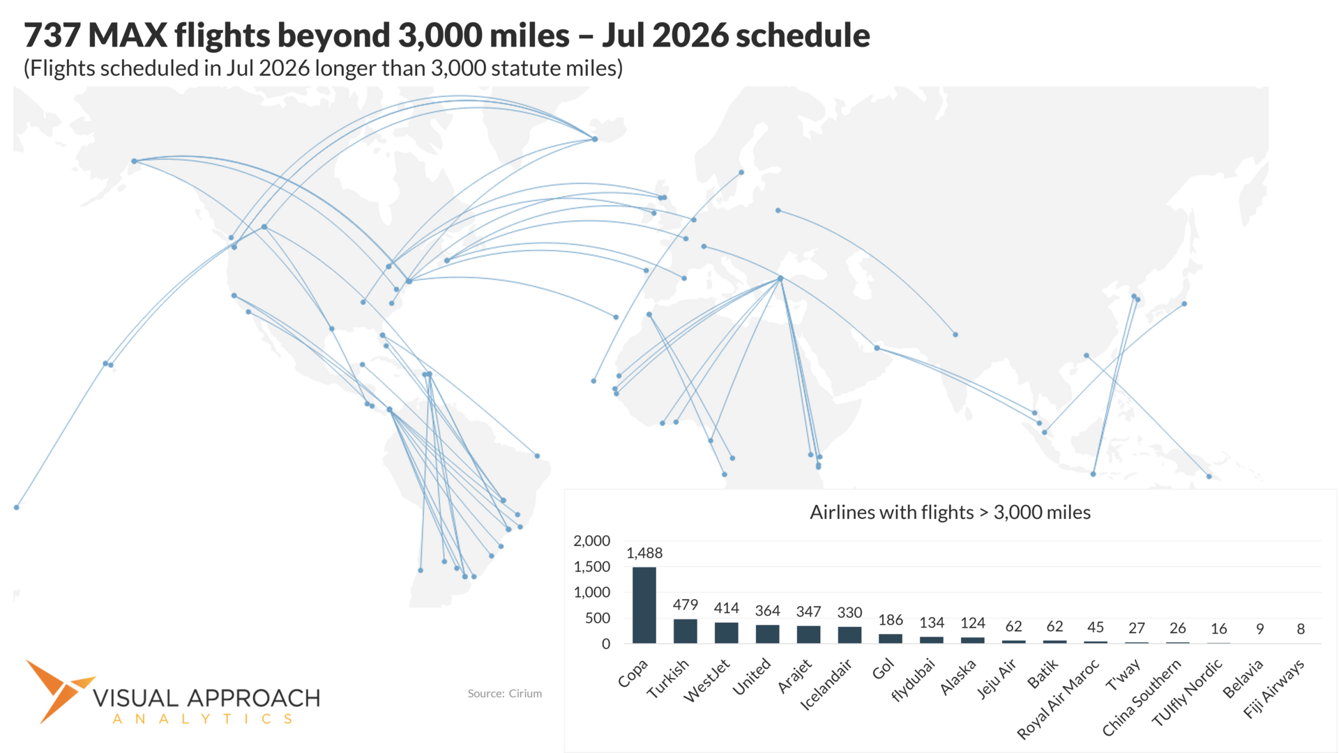 Our focus is more traditionally on airline competitive moves in their networks (for instance, those aggressive routes overlapping Spirit in anticipation of… something); however, this week we also looked at the 737 MAX and the long-haul flights extending beyond 3,000 miles.