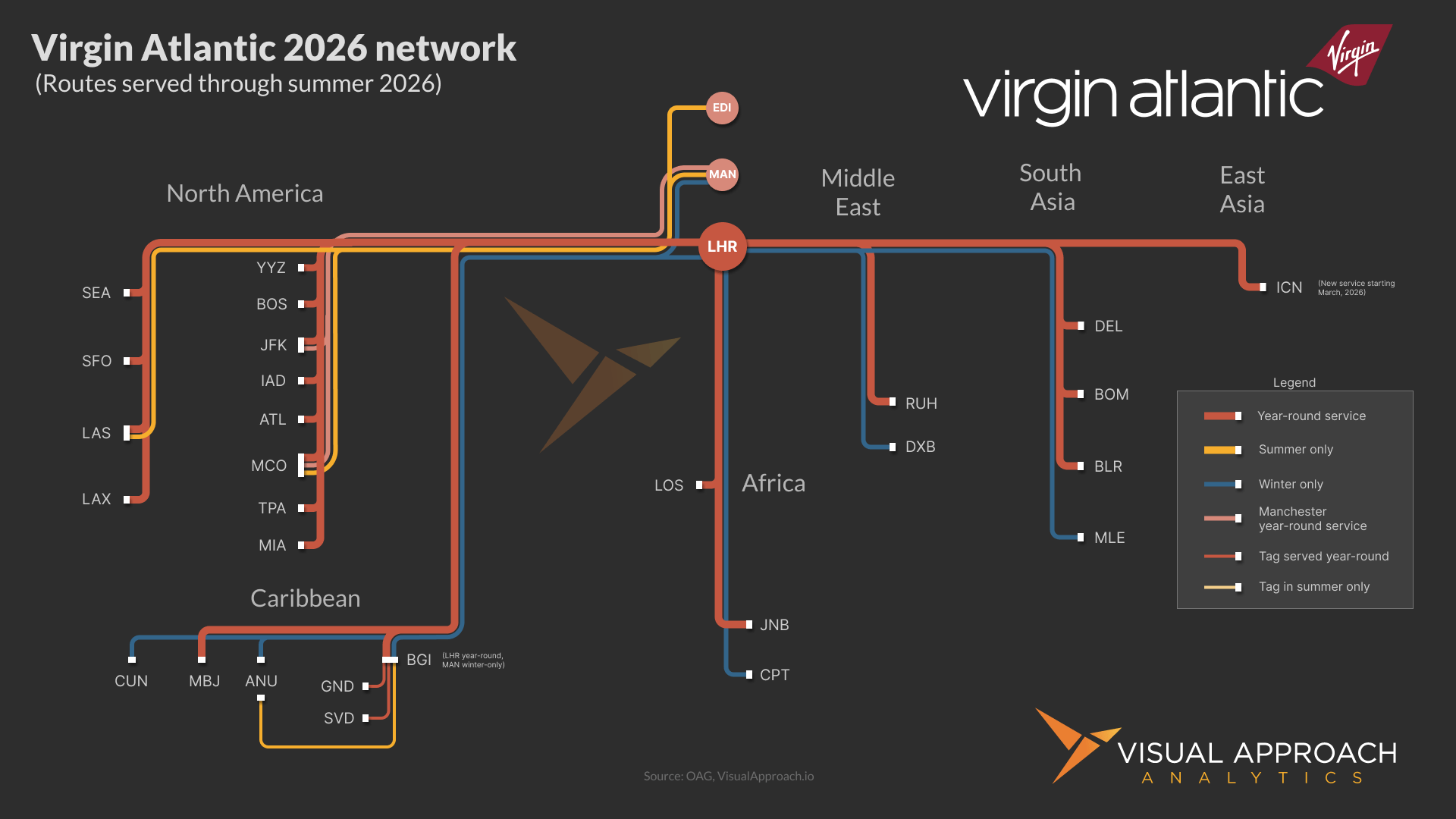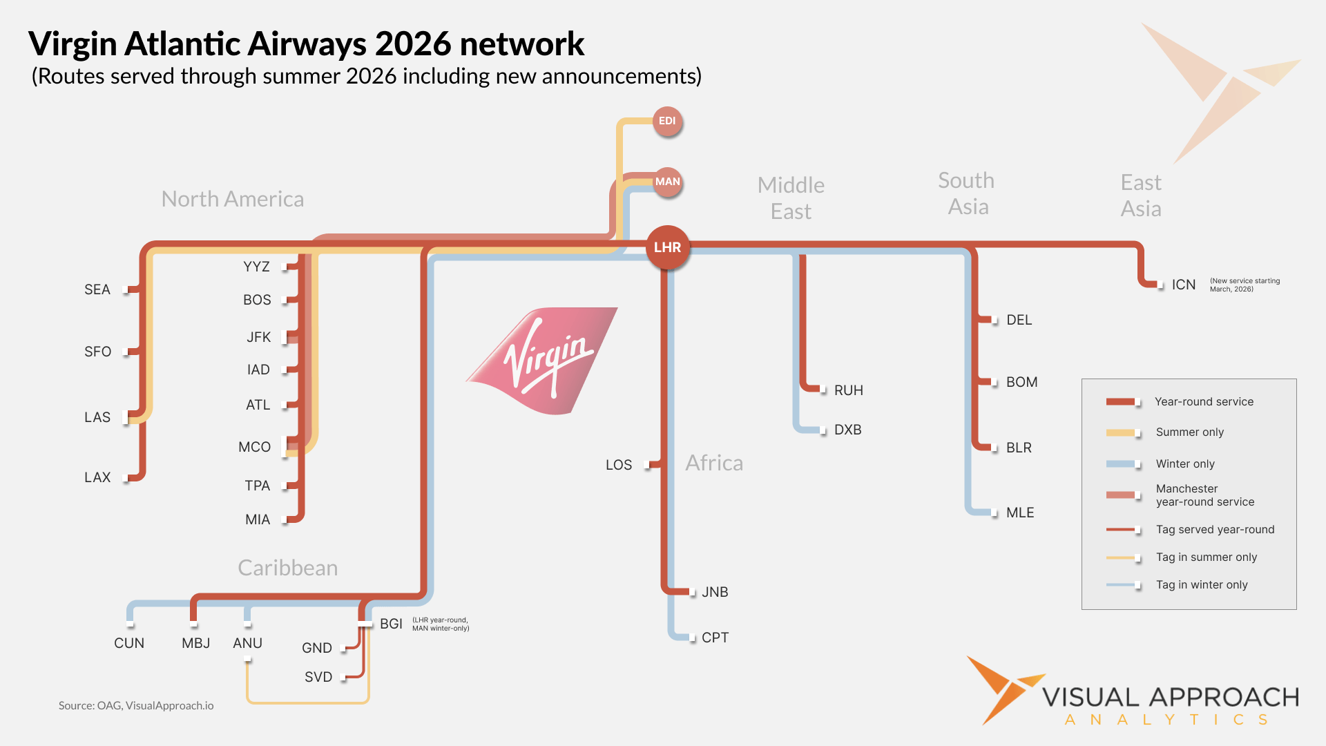 Rather than color each subway line by hub, we decided to highlight the year-round versus seasonal service Virgin Atlantic offers in its network. Summer routes skew into North America, while winter routes skew toward the warmer climates of the Caribbean, Cape Town, Dubai, and the Maldives.