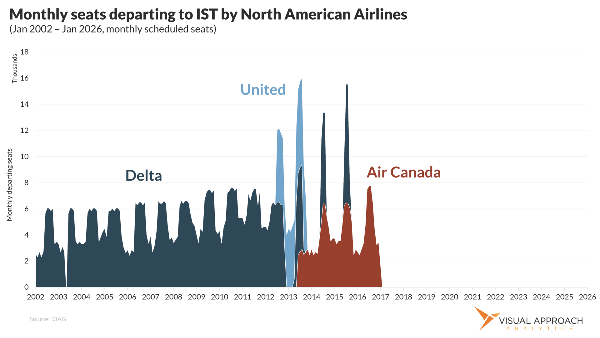 No North American airline has served IST since Air Canada did in January 2018. There was a brief peak-season dogfight between Delta and United, but it ended in 2013. Delta ultimately exited the market entirely in 2015.